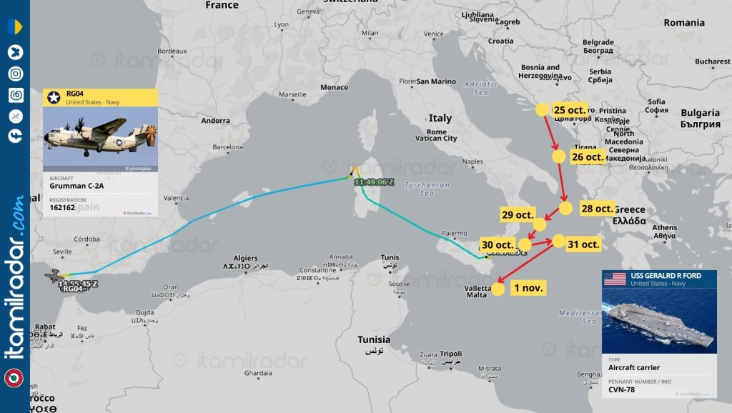 Кажется, мы наконец-то на месте. Военный корабль США "Джеральд Р. Форд" (CVN-78), судя по всему, направляется на запад, к Гибралтарскому проливу, и, следовательно, к своему конечному пункту назначения...